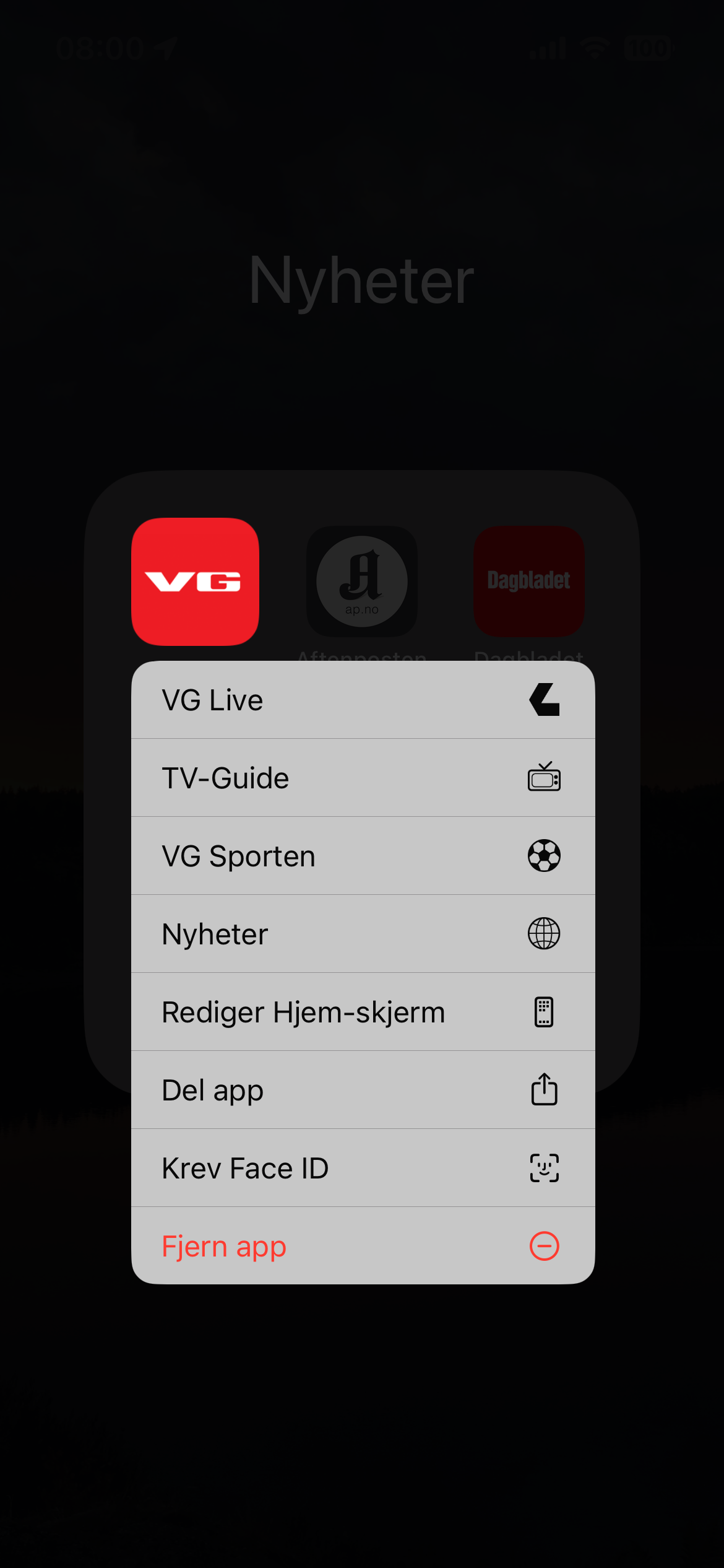 Her prøver vi å avinstallere appen VG. Trykk og hold på VG-ikonet gir dette skjermbildet:
