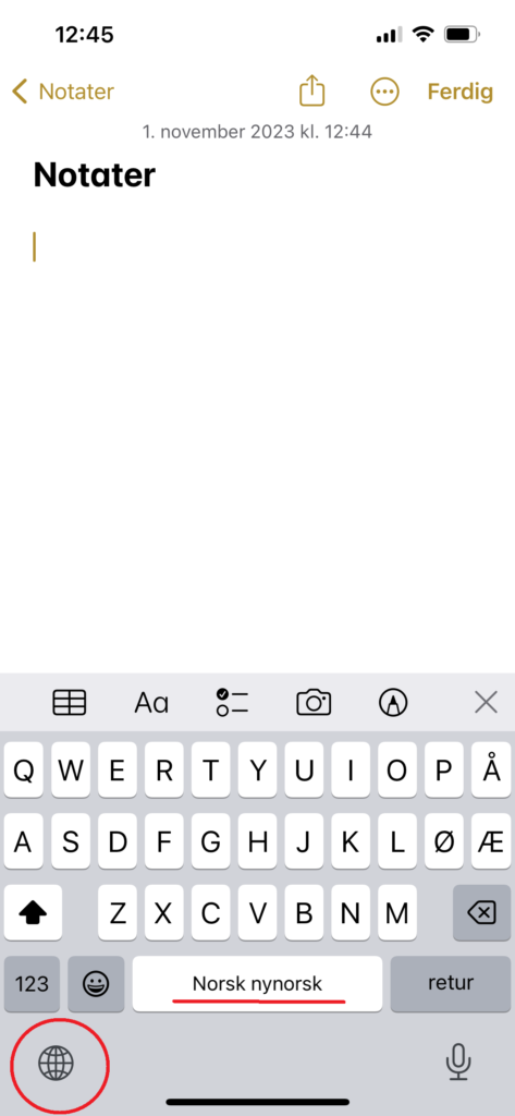 Når du har lagt til forskjellige tastaturer på din telefon kan du bytte mellom engelsk, bokmål, arabisk osv ved å trykke på globusen nede i venstre hjørne. Du vil legge merke til at mellomromstasten viser hvilket tastatur du endrer til. I bildet under kan du se at nynorsk tastatur er gjeldene tastatur nå.
