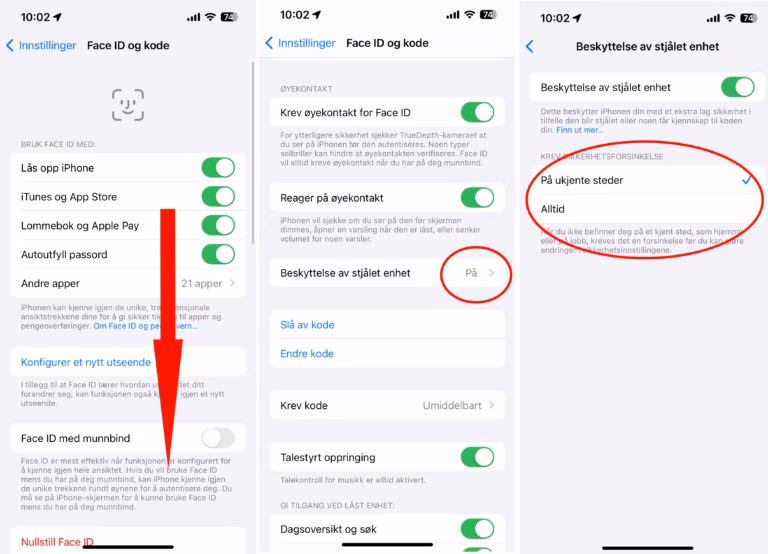 I bildet under, rull nedover til du finner «Beskyttelse av stjålet enhet» og klikk inn.