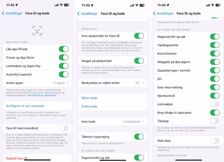 Du kan også velge hva som skal være tilgjengelig fra låst skjerm. Du ser innstillingene i bildet over, lengst til høyre. Hvis du er mye ute på reise, kan «Lommebok» være grei å slå på dersom du bruker den til å oppbevare billetter og boardingkort. Den nederste innstillingen, «slett data», er lur å slå på. Da kan ikke en som har stjålet telefonen din, forsøke i det uendelige å logge seg på enheten. Den vil slette alle data etter ti mislykte forsøk på å logge seg inn med pin-kode.