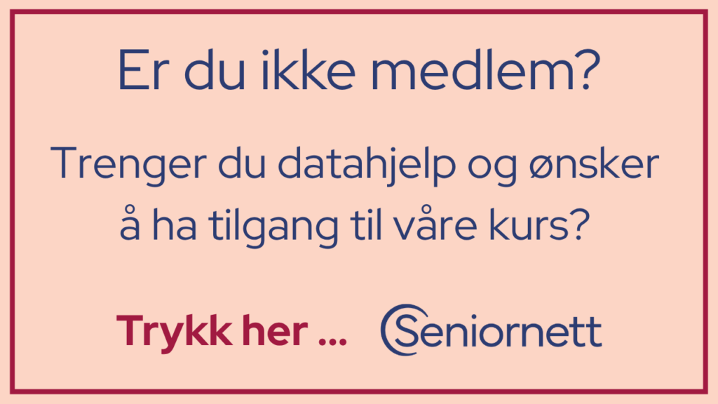 Hvis du har en kommentar til denne artikkelen skriv det inn i kommentarfeltet under. Du må være innlogget for å kunne kommentere. Logg inn her Logg inn – Seniornett Norge