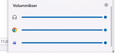 Ved å rulle litt nedover vil du også se Volummikser. Her setter du lydnivået ved å dra i den blå prikken. Vil du dempe lydnivået drar du den mot venstre. I eksempelet ser vi at lyden i hodetelefonene er den satt helt til høyde, altså full lyd. Du kan dra den blå prikken mot venstre for å dempe lyden.