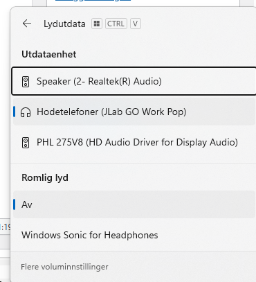 Her ser du hvilken enhet lyden er satt til å spille av på (i dette eksempelet Hodetelfoner. Du ser den blå markøren som viser hvilken enhet lyden nå sendes til). Hvis du heller vil at lyden skal spilles av på de innbygde høyttalerne på PC-en er det bare å trykke på Speaker (2-Realtek Audio). Det kan være litt vanskelig å forstå hva de ulike enhetene som vises er, men det vises kun de du har tilkoblet. I eksempelet overfor vises “HD Audio Driver for Display Audio”. Dette betyr høyttalerne på den tilkoblede skjermen.