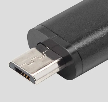 Mikro-USB. Den brukes gjerne på eldre mobiltelefoner, klokker og kameraer. Den er ikke vendbar.