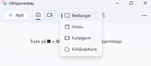Frihåndsform Tegne en frihåndsfigur rundt et objekt. Rektangel Dra markøren rundt et objekt for å lage et rektangel. Vindu Velg et vindu, for eksempel en dialogboks, som du vil ta skjermbilde av. Full skjerm Ta bilde av hele skjermen. Videoklipp Ta et videoklipp av et rektangulært utvalg av hvilken som helst del av skjermen du liker. Standardvalg er “Rektangel”.