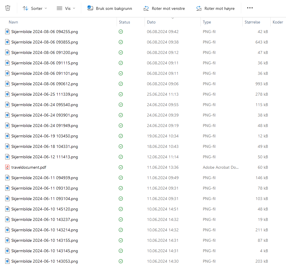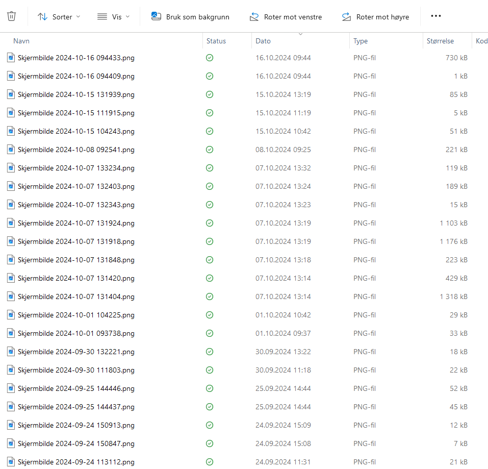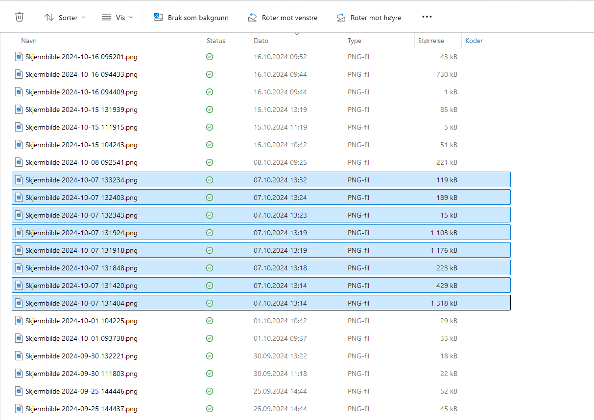 Jeg har en liste med bilder som jeg ønsker å slette. Jeg ønsker nå å slette alle bildene som er tatt den 7.oktober. Jeg tar opp utforsker og sorterer bildene på dato (trykker på Dato i overskriften). Da ser det slik ut: