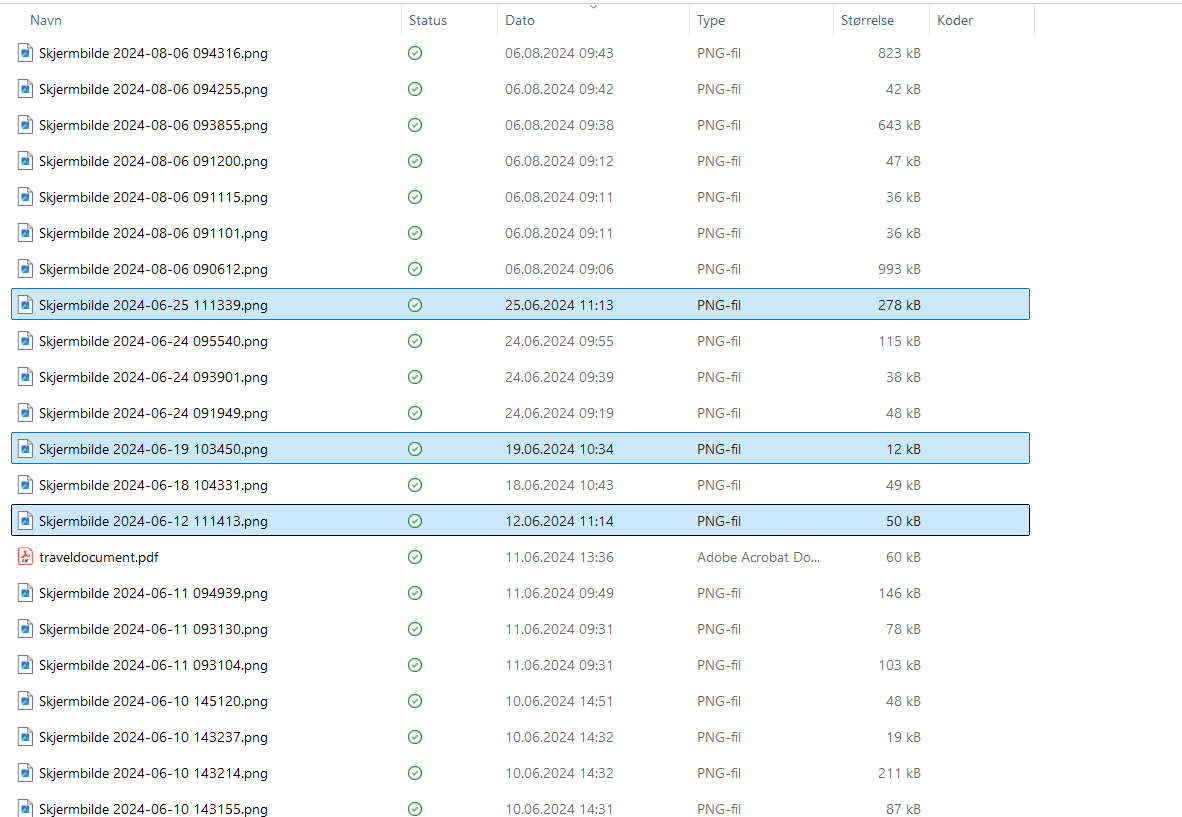 Nå trykker jeg på den filen som er fra 25.06. Deretter holder jeg Ctrl-tasten nede mens jeg trykker på filene fra 19.06 og 12.06. Da ser det slik ut: