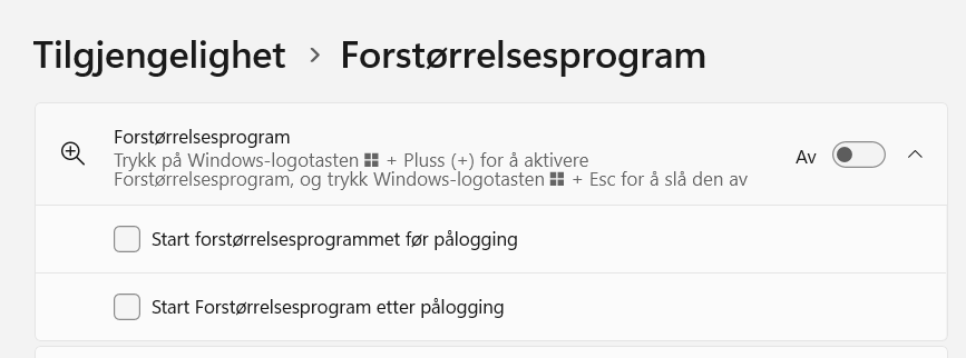 Trykk påWindows-tasten ++(pluss-tegnet) for å slå på forstørrelsen. For å slå av, trykkWindows-tasten +Esc