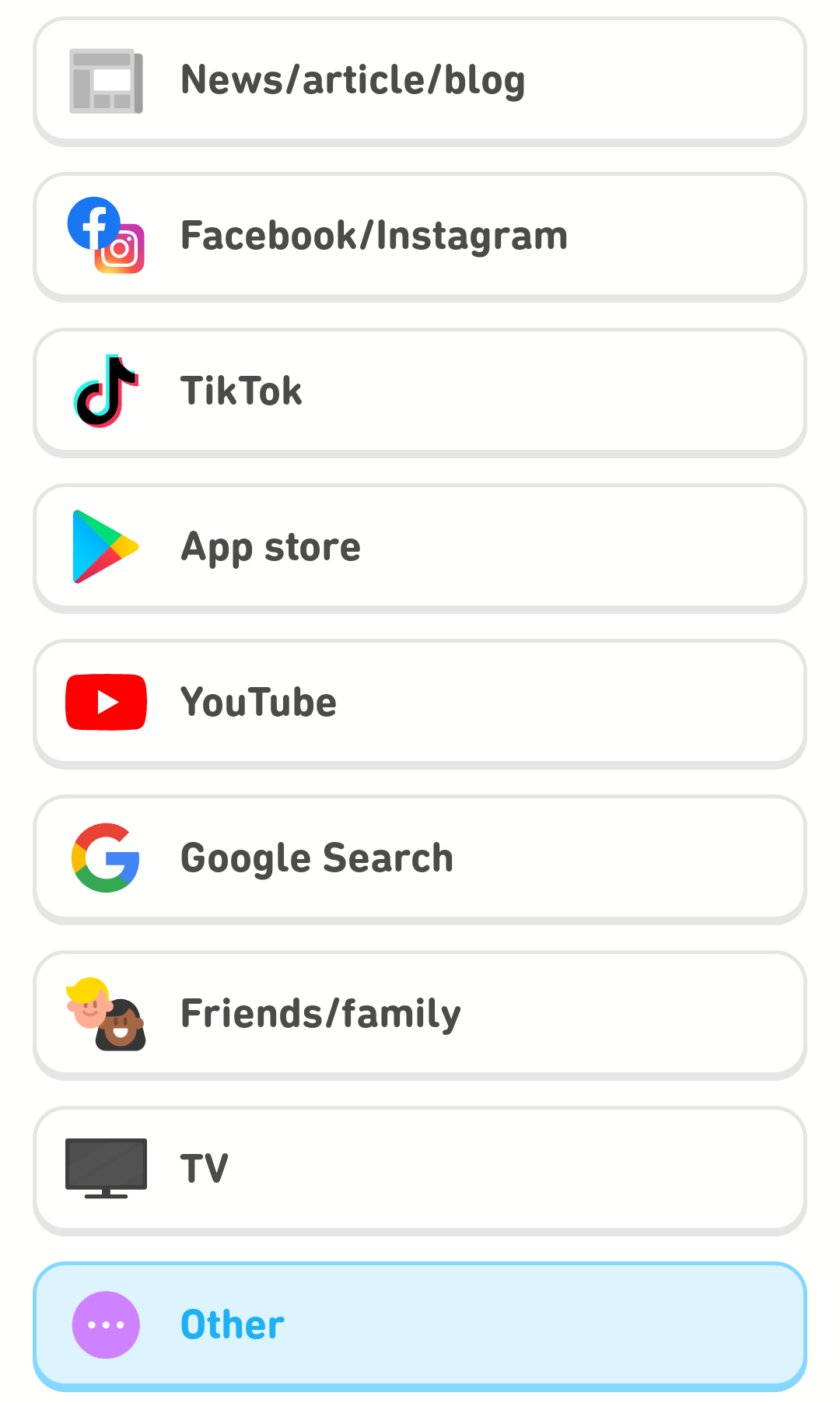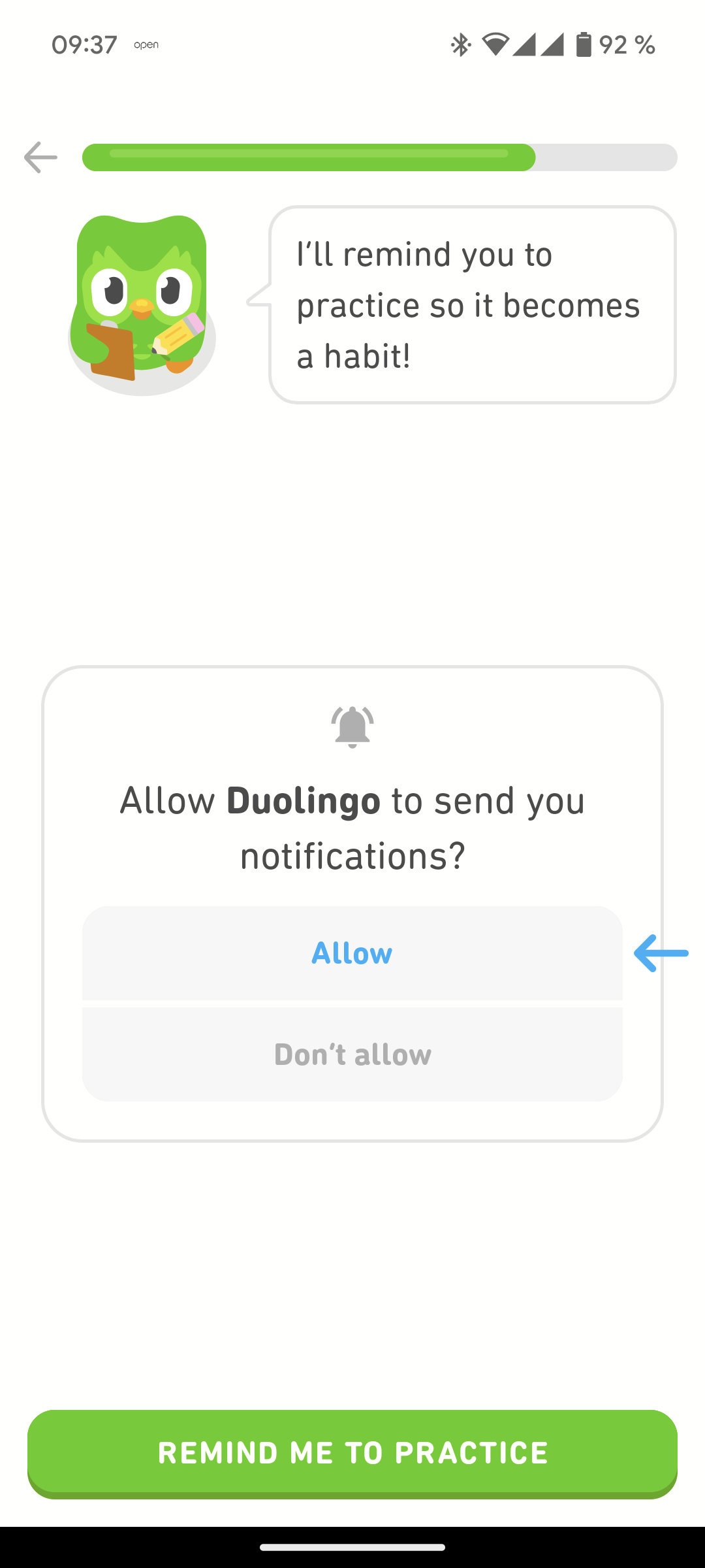 Etter at du har trykket på Create profile-knappen, skriver du inn din alder, ditt fornavn og din e-post adresse. Trykk på “Next” hver gang for å gå videre. Deretter skriver du inn et passord og trykker på «Create profile». Til slutt trykker du på «No thanks» nederst på skjermen, på spørsmålet om du vil kjøpe et «Plus abonnement». (Med mindre du vil betale for noen flere fordeler og å slippe annonser, men det er ikke nødvendig for å lære deg språk.)