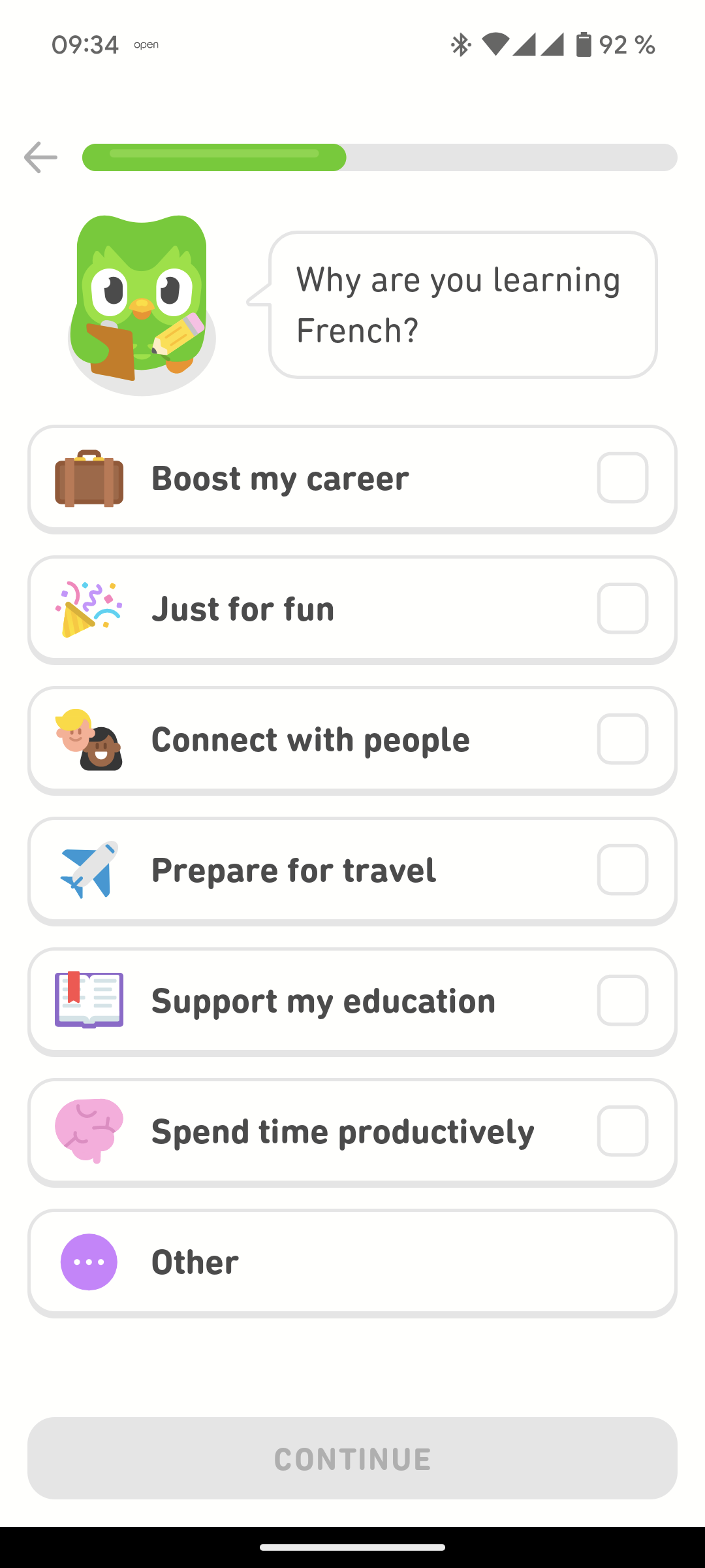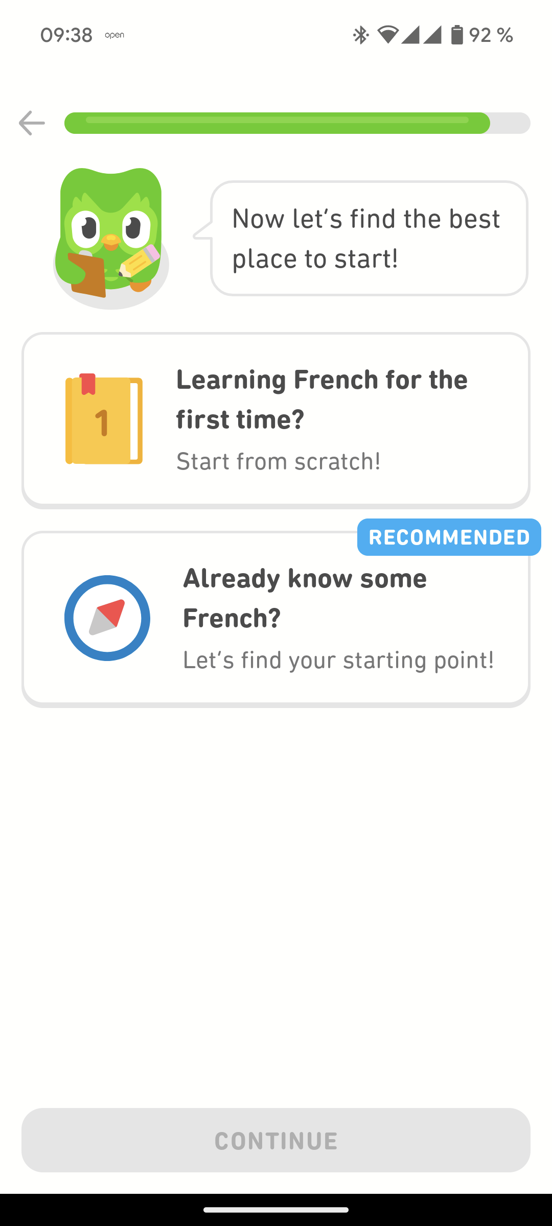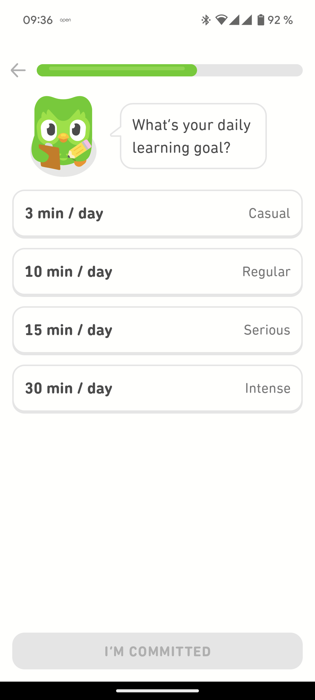 Du trykker på “Continue” for å gå videre. Til slutt må du svare på hvor lang tid du ønsker å bruke på kurset (du kan endre dette senere hvis du ønsker).