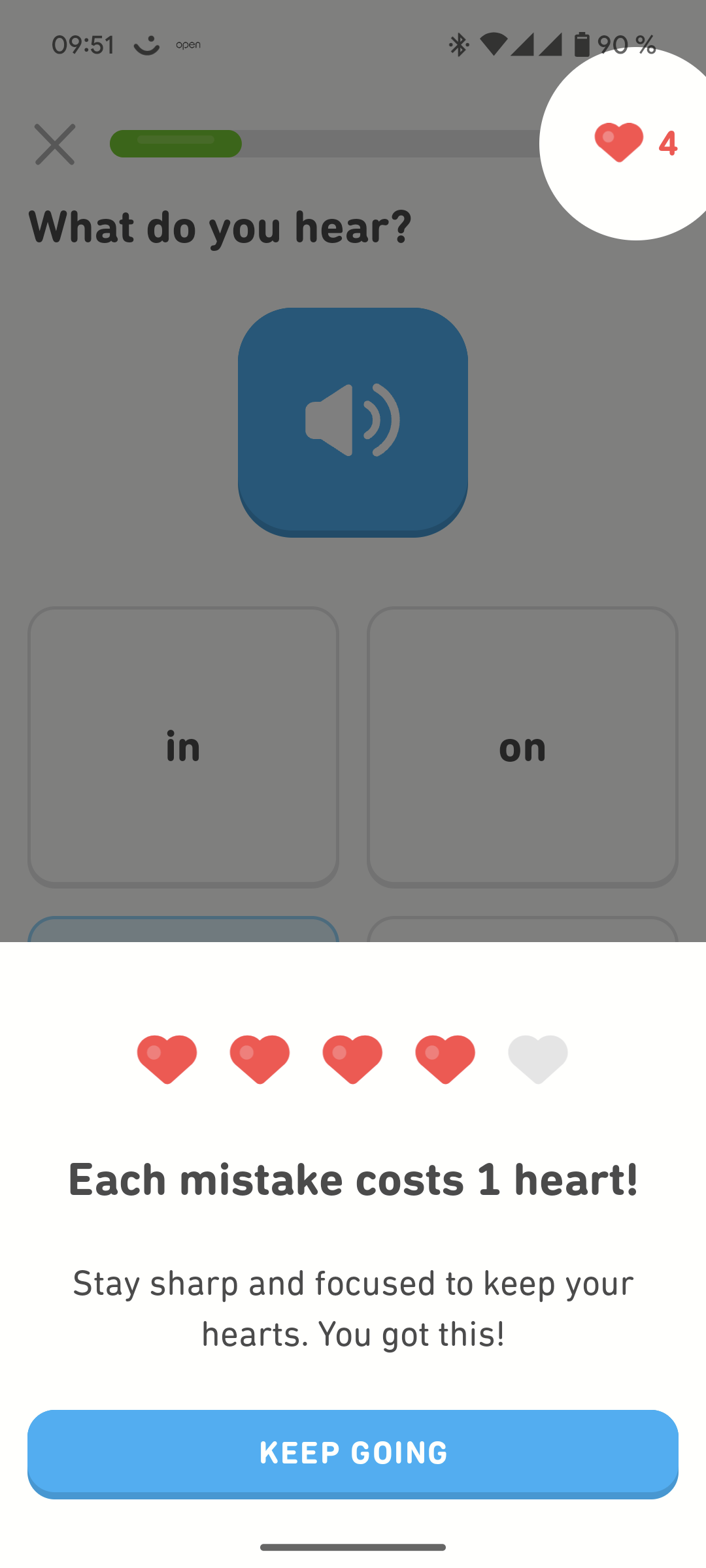 Svarer du feil må du “betale” med et hjerte (som du fikk ved starten):