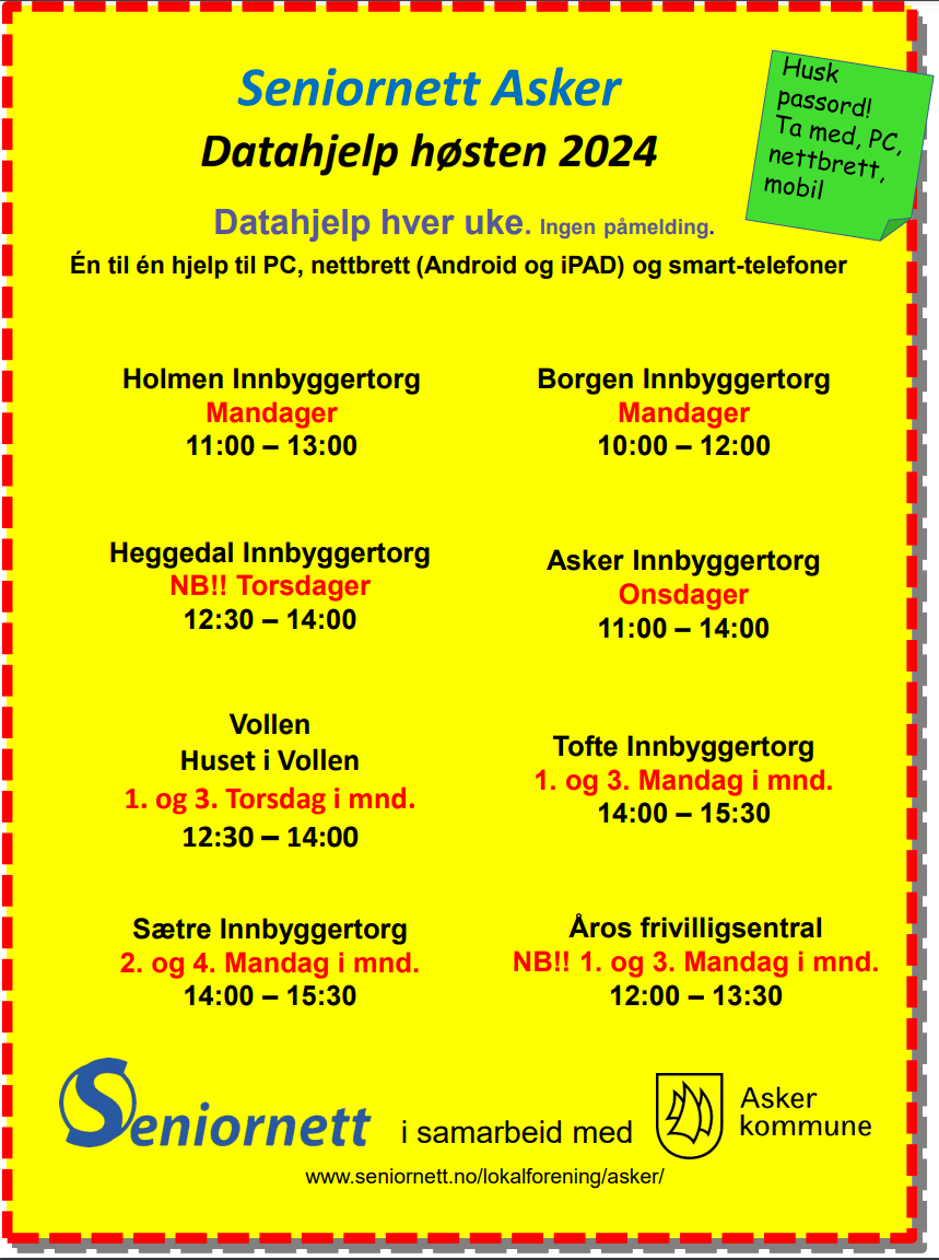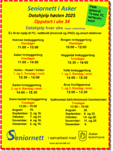 Seniornett Asker tilbyr i samarbeid med Asker kommune møteplasser hvor innbyggere kan skaffe seg digitale kunnskaper og ferdigheter. Vi har hele 10 møteplasser i kommunen hvor vi driver veiledning.
