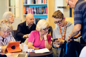 Her kan du få hjelp til å øke grunnleggende digitale ferdigheter som: Bruken av helsetjenester på nett, publisere på Facebook, redigere bilder, surfing, skriving osv. Ingen spørsmål er for dumme – vi hjelper deg!
