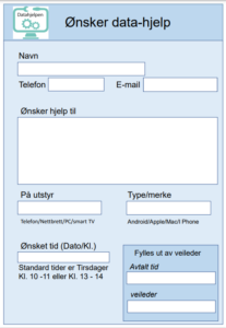 Du kan bestille ønske om datahjelp “En til En” på biblioteket, servicekontoret til kommunen og frivillig sentralen.