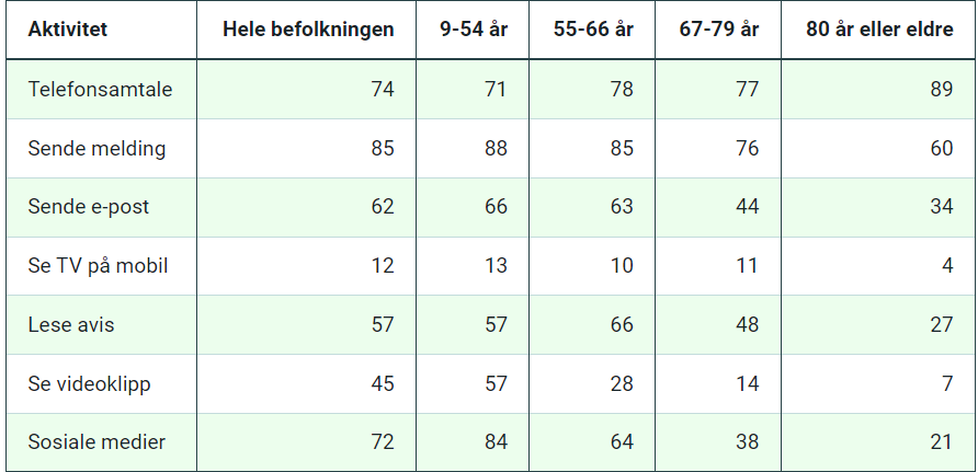 Legg merke til at i den midterste aldersgruppen bruker kvinner telefon mer enn menn.