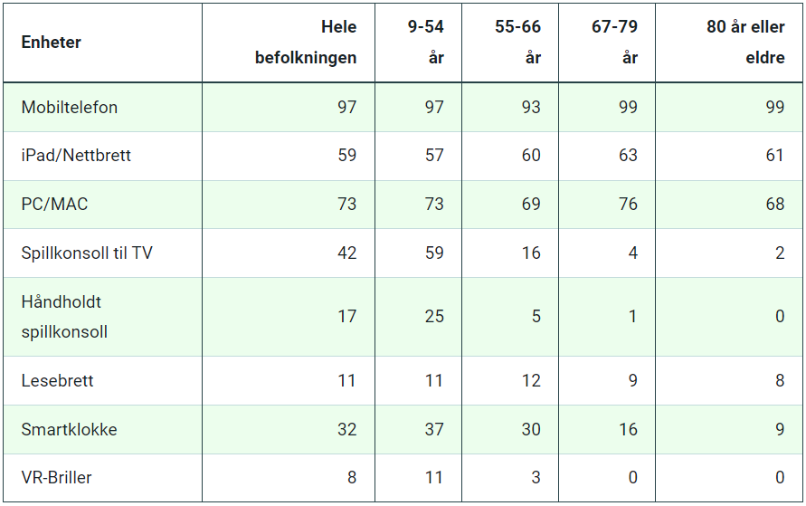 Her snakker vi om ulike digitale “dingser”. Vi viser også her alle aldersgrupper slik at man kan sammenligne seniorer med ikke-seniorer.