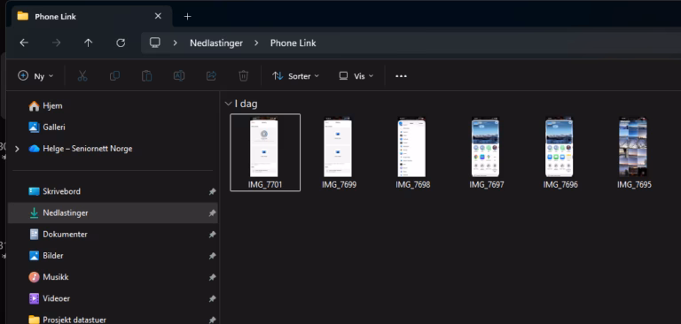 I neste trinn går du til PC-en din og klikker inn på «Nedlastinger», deretter går du inn i mappen «Phone link». Her finner du alle bildene du har overført. Derfra kan du flytte dem til den mappen du ønsker å ha bildene i. Phone link mappen er bare en mottaksmappe og du bør lagre bildene dine i en annen mappe, for å få best mulig oversikt over bildene dine.