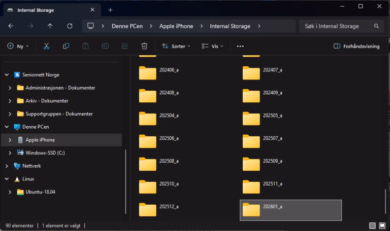 Du vil nå se alle mappene dine på iPhonen, disse er organisert i år og måned. I vårt eksempel går vi inn i 2026 mappen for januar, den heter «20261_a».