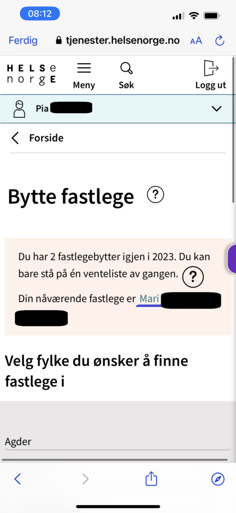 Her vil du finne info om hvor mange fastlegebytter du har igjen og hvem din nåværende fastlege er.