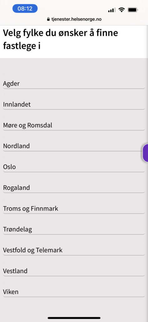 For å lete etter en ny fastlege må du først velge fylke, kommune/bydel. Eller du kan søke på navnet til en spesifikk fastlege hvis du ønsker det.