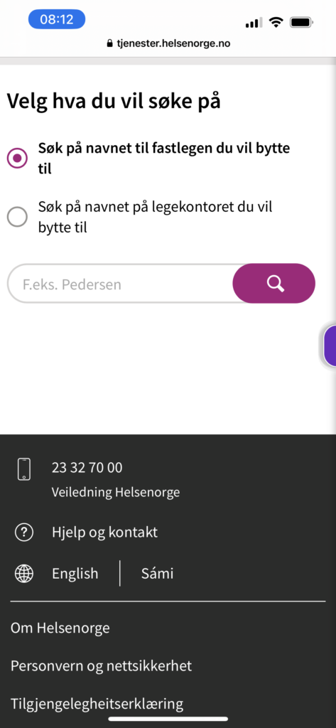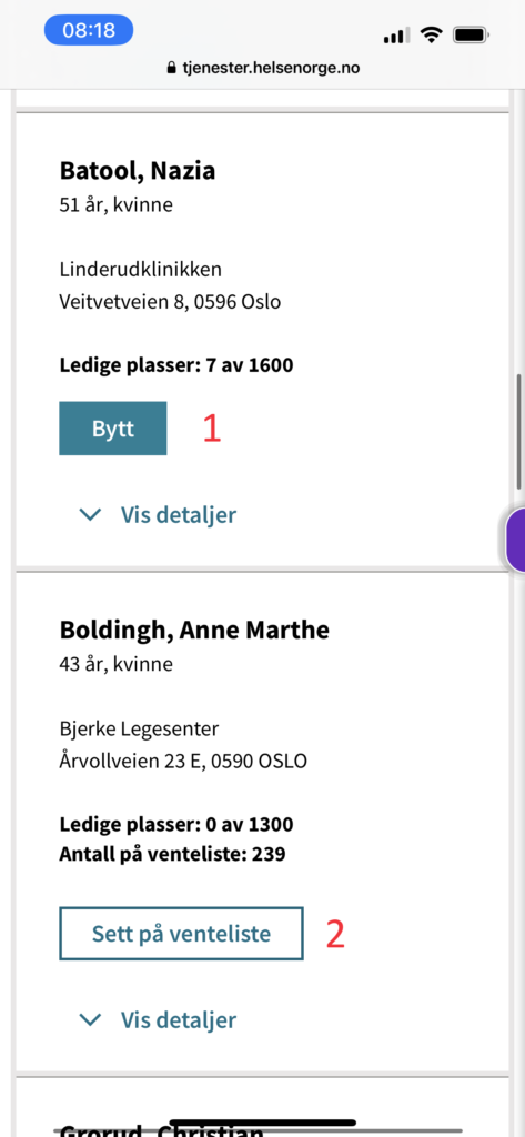 Du kan bare velge en fastlege som har ledig plass og byttet trer i kraft ved månedskifte. Frem til da vil du fortsette hos din nåværende fastlege.