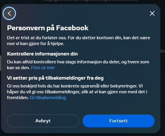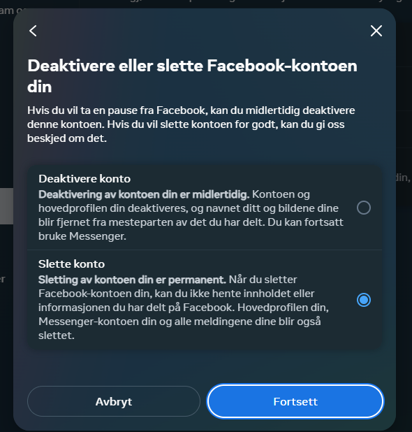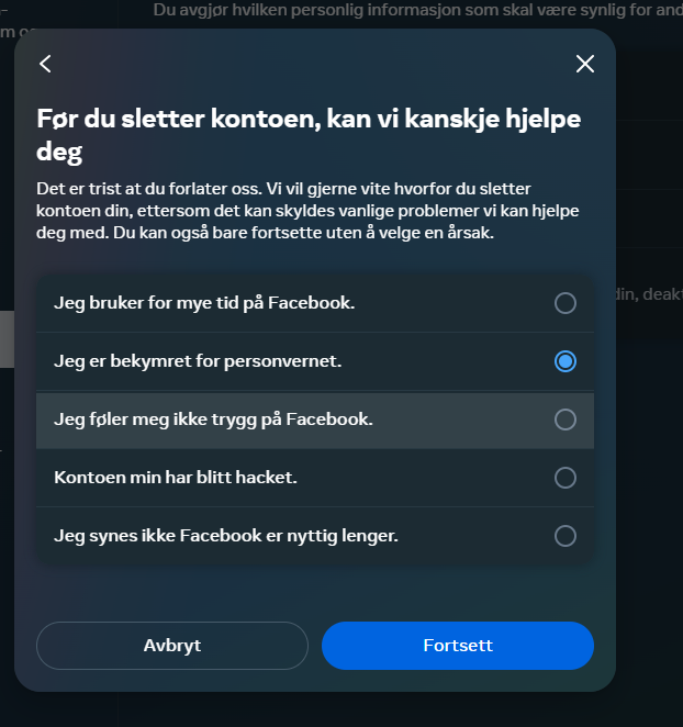 Nå må du velge hvorfor du ønsker å slette kontoen. Gjør ditt valg og trykk “Fortsett”.
