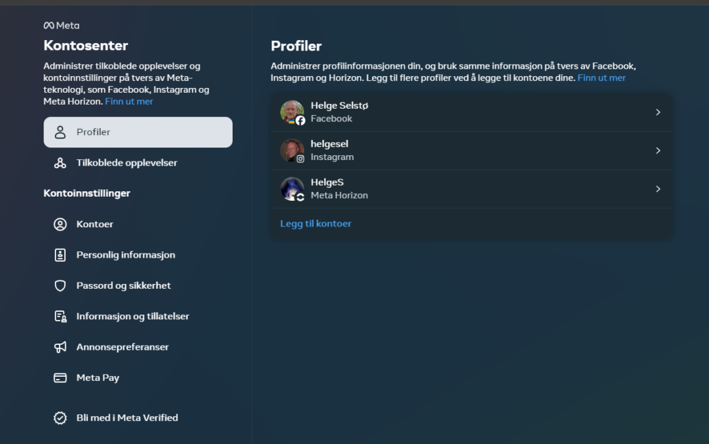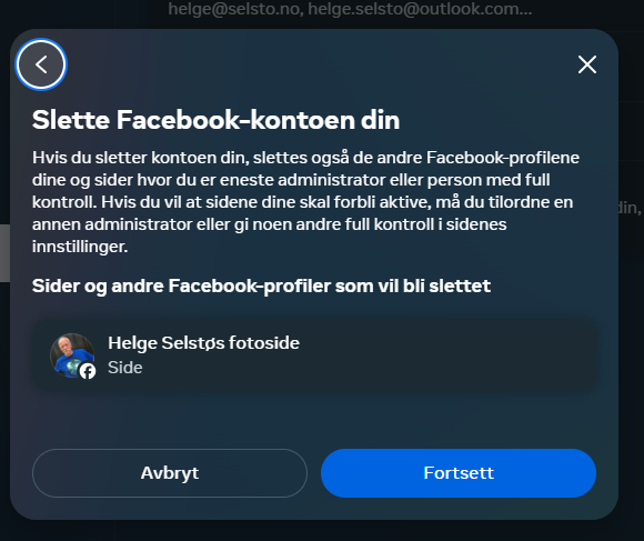 Hvis du har sider du administrerer får du nå varsel om dette. Hvis det er greit å slette de andre profilene dine, trykk “Fortsett” Hvis du ikke har det, slipper du dette steget.