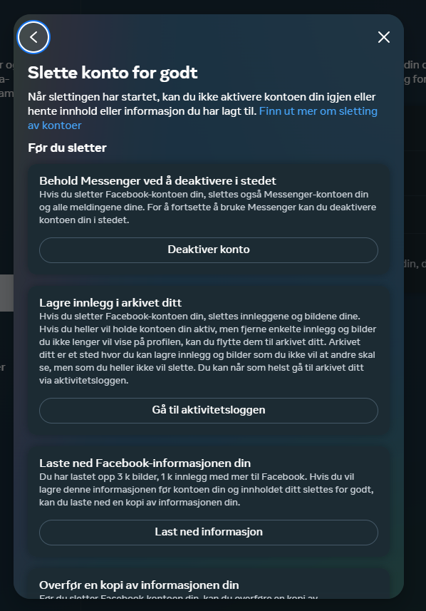 Etter at du har skrevet inn passordet ditt, får du informasjon fra Facebook om at du er i ferd med å slette kontoen din. Du har 30 dagers “angrefrist” på denne slettingen. Det vil si dersom du ønsker å slette kontoen for godt, klikker du «Slett konto» og venter i 1 måned før du sjekker om kontoen din er slettet. Forsøker du å logge deg inn på Facebook før disse 30 dagene er over har du gjenåpnet Facebook-kontoen din igjen.