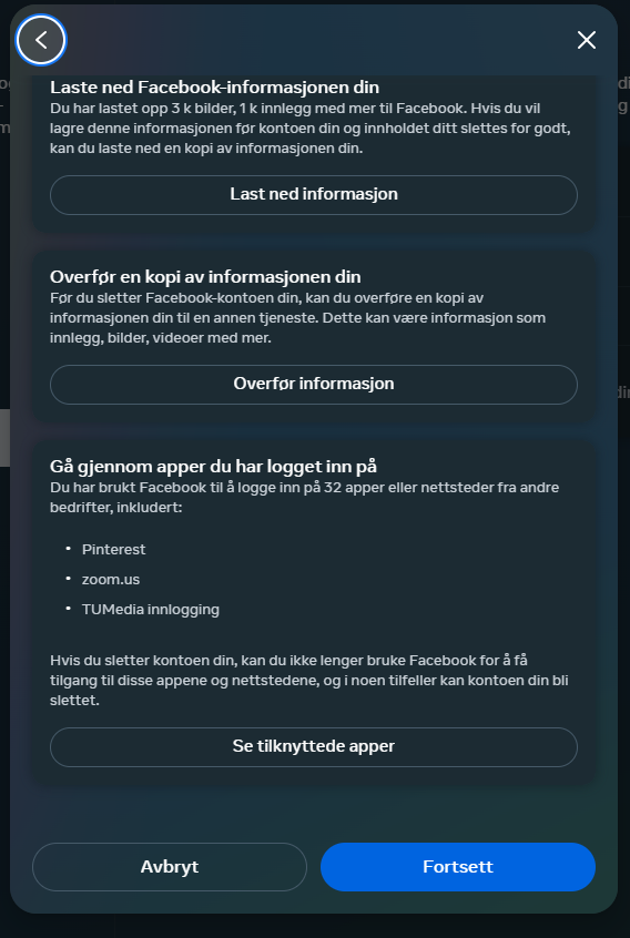 Rull ned all informasjonen og se hva det står i siste del. Her ser du at artikkelforfatter hadde brukt Facebook til pålogging flere steder og får advarsel om at disse nå blir borte. Det kan føre til at du ikke får logget deg inn på disse kontoene senere. Sjekk dette nøye dersom du får advarsel om det. Når du er klar, trykk “Fortsett”