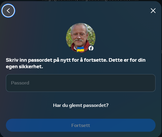 Når du har klikket på “Fortsett” må du skrive inn passordet til Facebook-kontoen din for å bekrefte at dette er din konto. Klikk fortsett når du har skrevet inn passordet. Se bildet under.