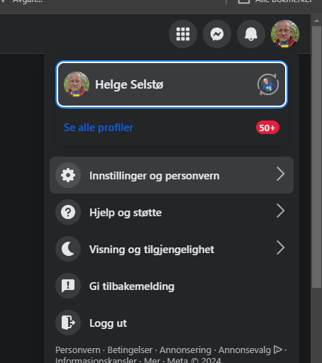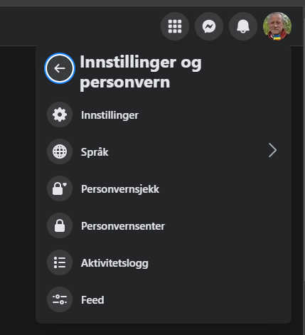 Disse trinnene er like for både mobil og nettbrett-app, bortsett fra trinn en. På mobil/nettbrett trykker du på meny. På PC og Mac trykker du på det lille runde profilbildet øverst til høyre, se bilde under. Deretter trykker du på “Innstillinger og personvern”.