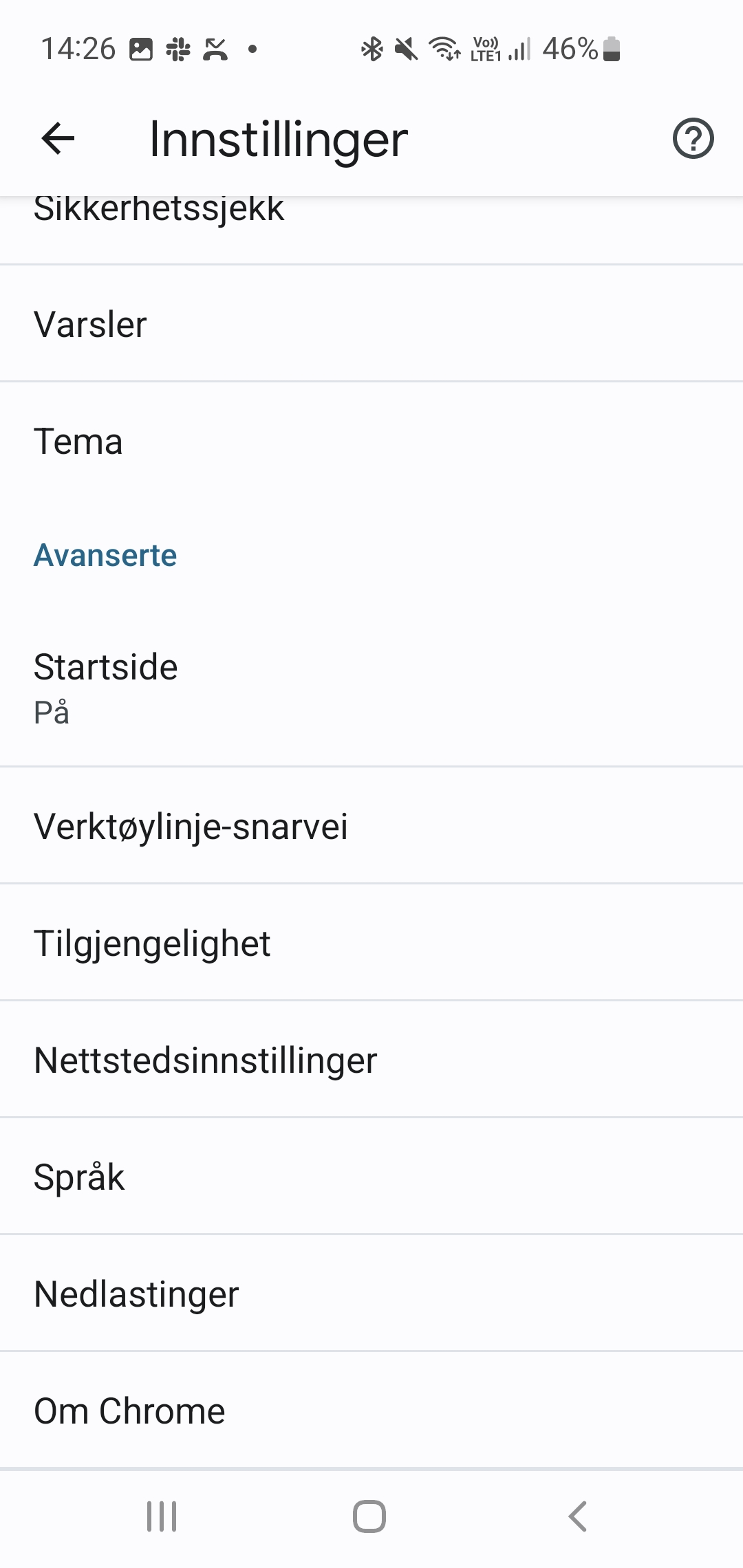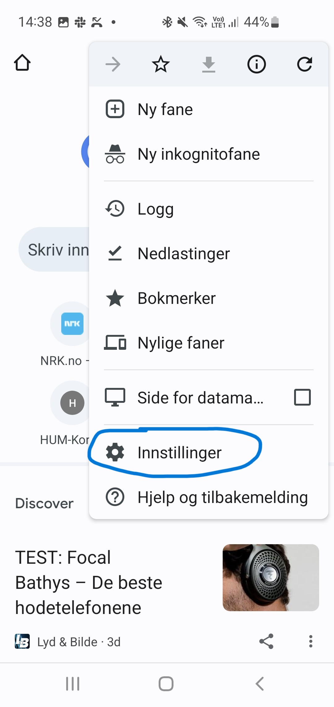 - Velg de 3 prikkene øverst i høyre hjørne. Da får du en meny. Velg “Innstillinger” fra menyen.