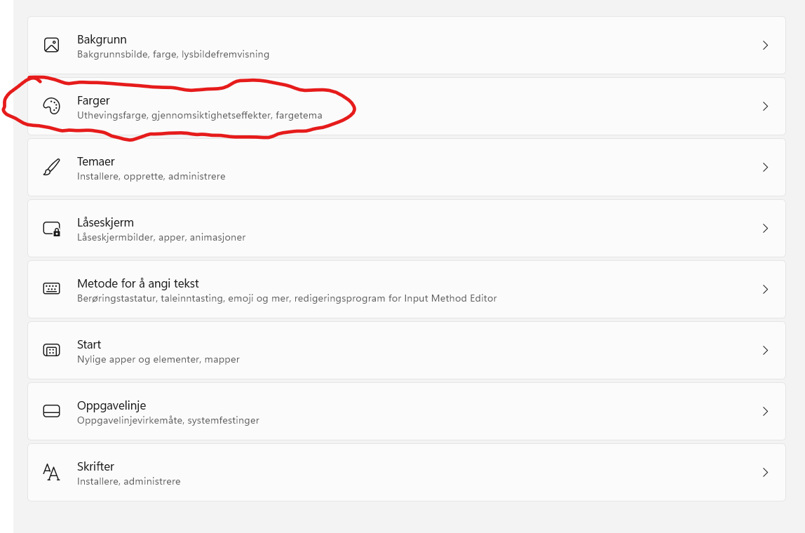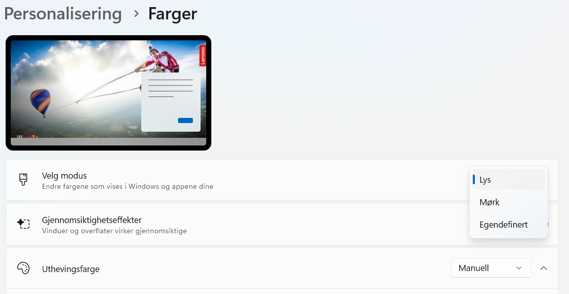 Under “Velg modus” kan du velge mellom Lys og Mørk, eller du kan definere selv fargene.Prøv deg frem!