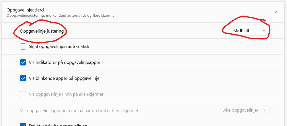 Mange ønsker seg tilbake til slik det så ut i Windows10, der start-knappen ligger nederst i venstre hjørne istedenfor midtstilt. Dette er enkelt å fikse: