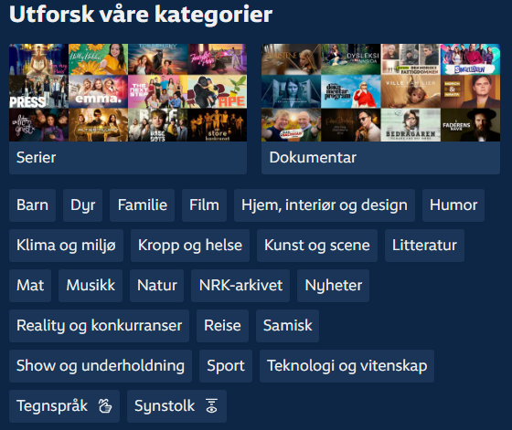 Velger du Kategorier vil du se de kategoriene NRK har gruppert programmene sine etter:
