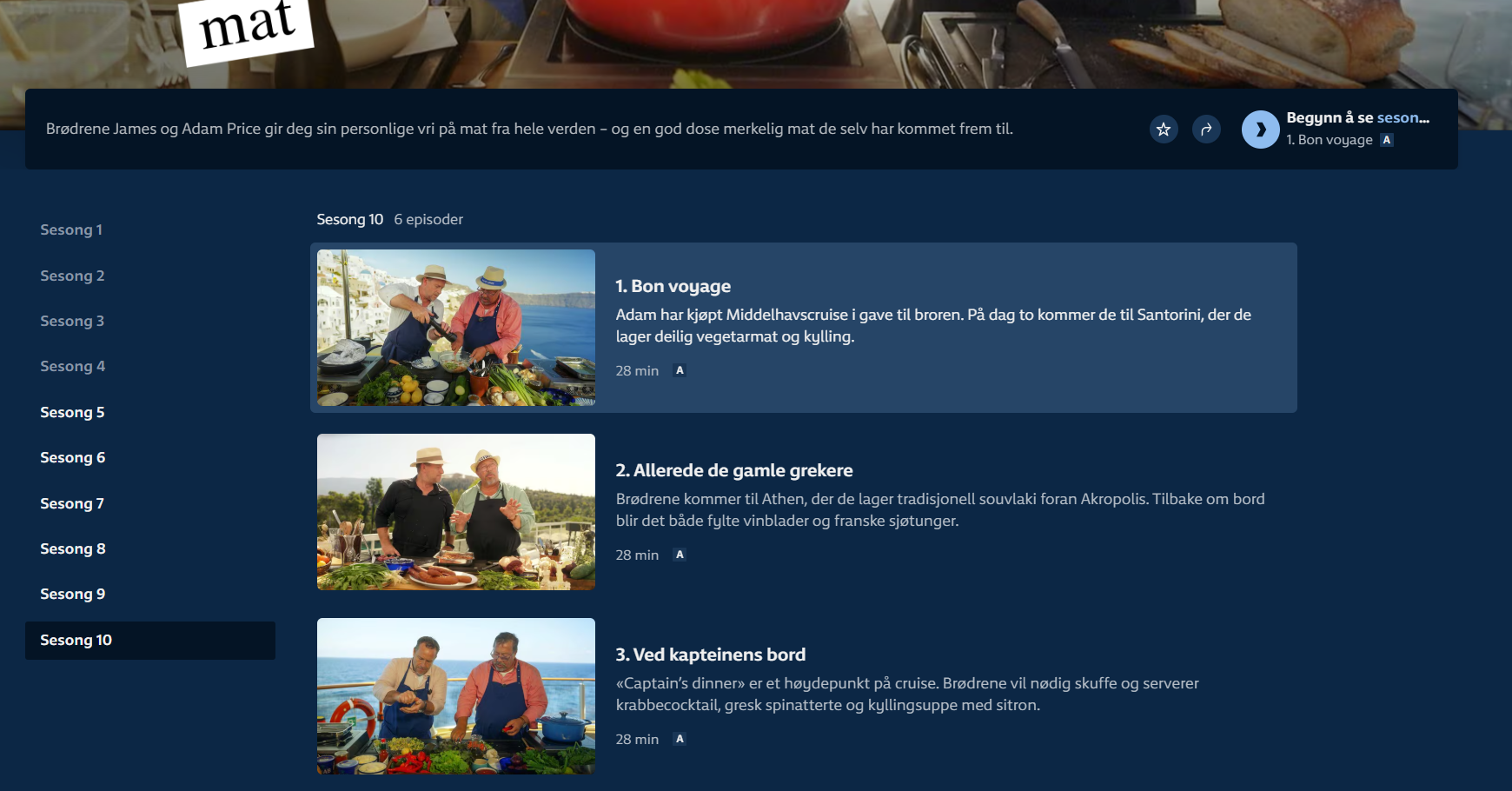 Her ser vi at siste sesong er sesong 10. Ved å trykke på teksten til episode 1 (som heter Bon Voyage) vil den begynne å spille av denne episoden.