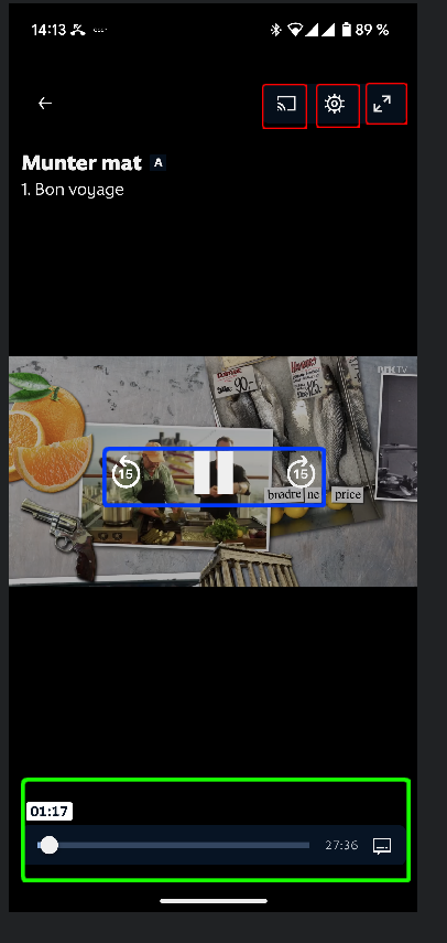 De med grønn markering viser hvor lang episoden er (i dette tilfellet 27 minutter og 36 sekunder). Prikken markere at jeg har kommer ett minutt og 17 sekunder ut i programmet.
