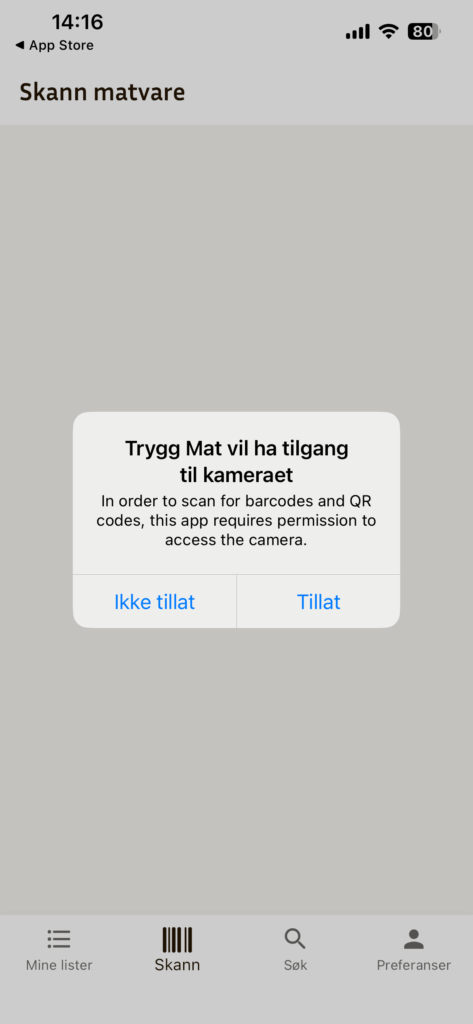 Hvis du er i butikken og handler kan du trykke på valget skann, nederst på skjermen. Du må da gi tilgang til kameraet ditt, se bildet under.