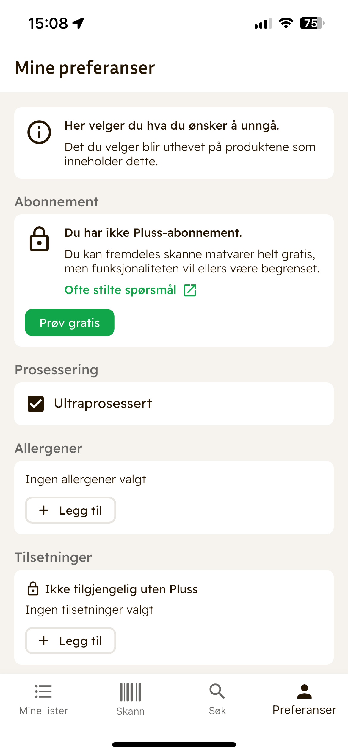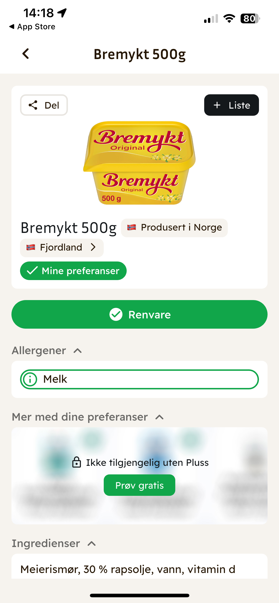 Hvis du trykker på preferanser kan du legge til hvilke allergener du ikke tåler slik at de matvarene som inneholder dem vises med rød farge.