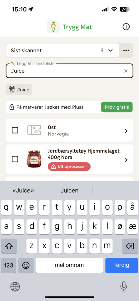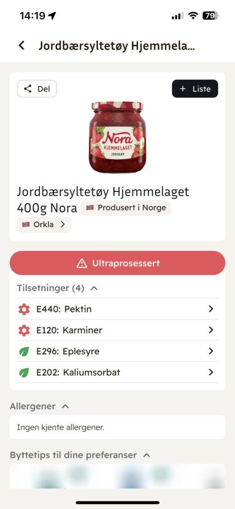 Den neste varen vi tester er “Hjemmelaget” jordbærsyltetøy. Den er nok fabrikklaget og vi ser at det kommer opp med rød advarsel om at varen er ultraprosessert. Vi ser også hvilke stoffer det er som gjør den til ultraprosessert. Det er Pektin som gjør syltetøyet stivt og Karminer som gir rødfargen.