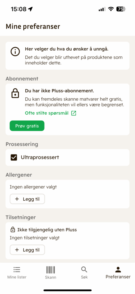 Første gang du starter appen, er startbildet tomt. I gratisversjonen kan du sette i gang og skanne matvarer. For å bruke søkeverktøyet må du betale for appen, det koster 39 pr mnd eller 299 pr år.