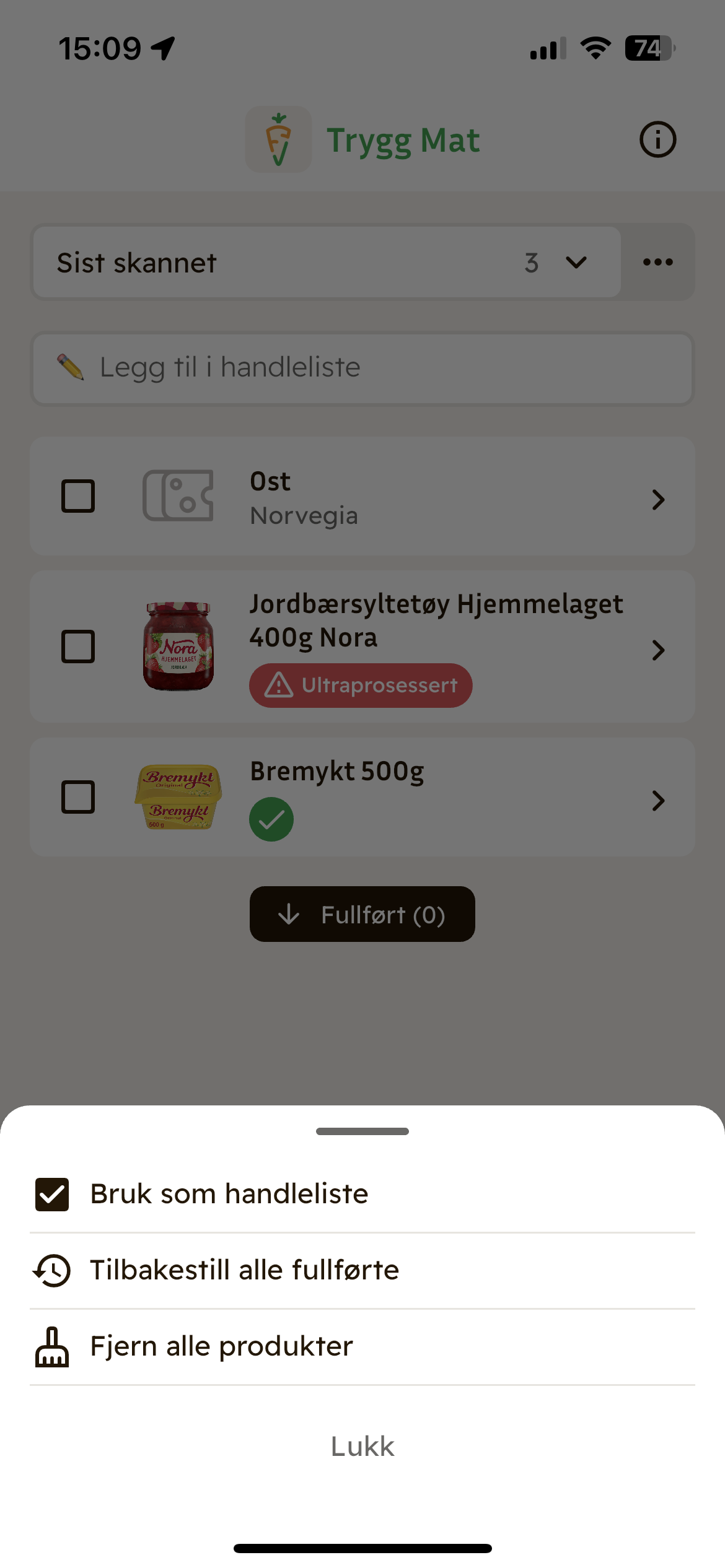 På hovedsiden, eller dersom du trykker på mine lister kan du trykke på tre prikker oppe til høyre og velge varene i listen som handleliste. Du kan også fjerne alt i listen, slik at den er klar til bruk. Hvis du bruker den som handleliste kan du legge inn de produktene du måtte ønske i listen, men de vil ikke vises med innhold, da må du skanne varen du plukker for å sjekke.