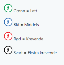 For symbolene som viser turforslag, for eksempel fotturer, sykkelturer eller kanoturer, er det fire forskjellige farger som kan vises på kartet. Fargene gjenspeiler vanskelighetsgraden for turene.