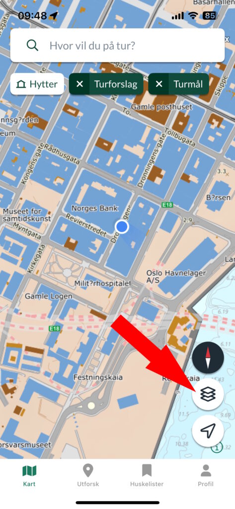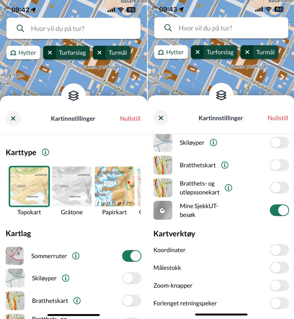 Etter at du har trykt på knappen, med tre ark, dukker bildet under opp. Der kan du velge hva slags kart og visning i kartet du ønsker. I vårt eksempel er topokart, sommerruter og mine SjekkUT besøk valgt.