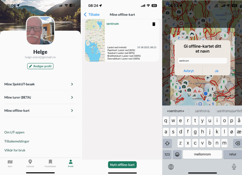 Offline-kart er nyttig, det er ikke så vanskelig å laste ned. Hvis du trykker deg inn på profilen din, det lille hodet nederst til høyre, kan du velge “Mine offline kart”. Hvis du har valgt et kart og lastet det ned ser du det her. Skal du laste ned et nytt kart, trykk på den grønne knappen. “Nytt offlline-kart”. Dra kartet til området du vil laste ned og zoom til passe utvalg. Trykk på lagre og gi kartet et navn og trykk “Ja”. Dermed er kartet lagret lokalt på din mobil. Da trenger du ikke datatilgang for å bruke kartet. Det vil også fungere på de stedene det ikke er mobildekning.