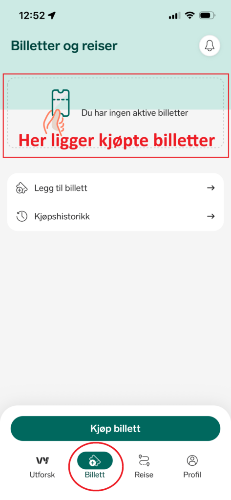 Når kjøpet er fullført, finner du billetten under Billett i menyen.