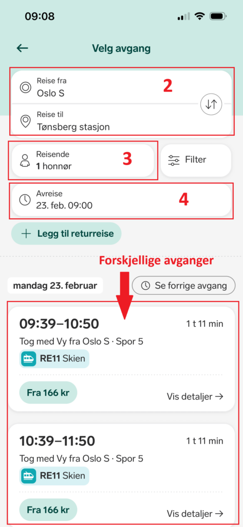 - Trykk på avgangen du ønsker og se på detaljene
