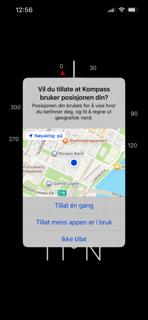 Første gang du åpner appen vil den be om tillatelse til å bruke posisjonen din. Her kan du velge hva du er komfortabel med, i dette tilfellet ble det valgt “Tillat mens appen er i bruk“.