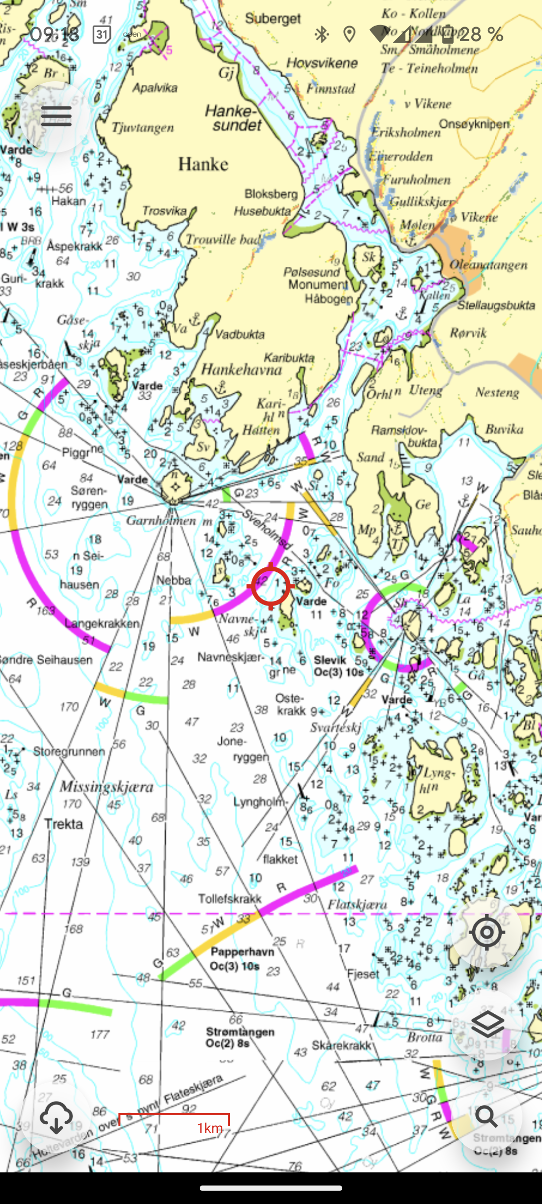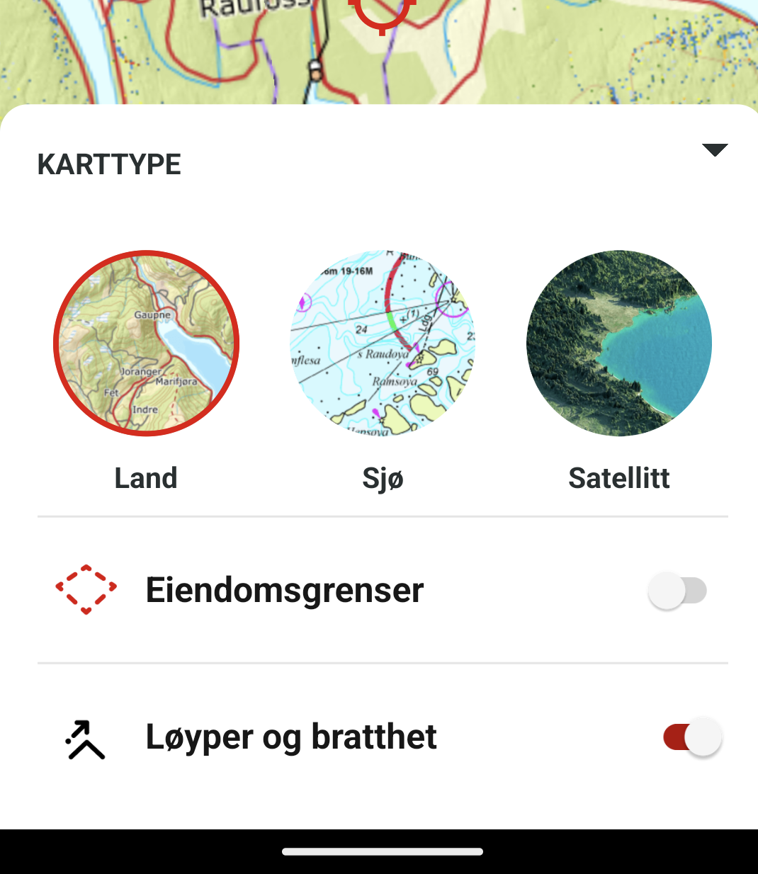 Ved å trykke på “karttype”-knappen kan du velge å vise sjøkart. Kjekt hvis du er på sjøen og mangler kartplotter.