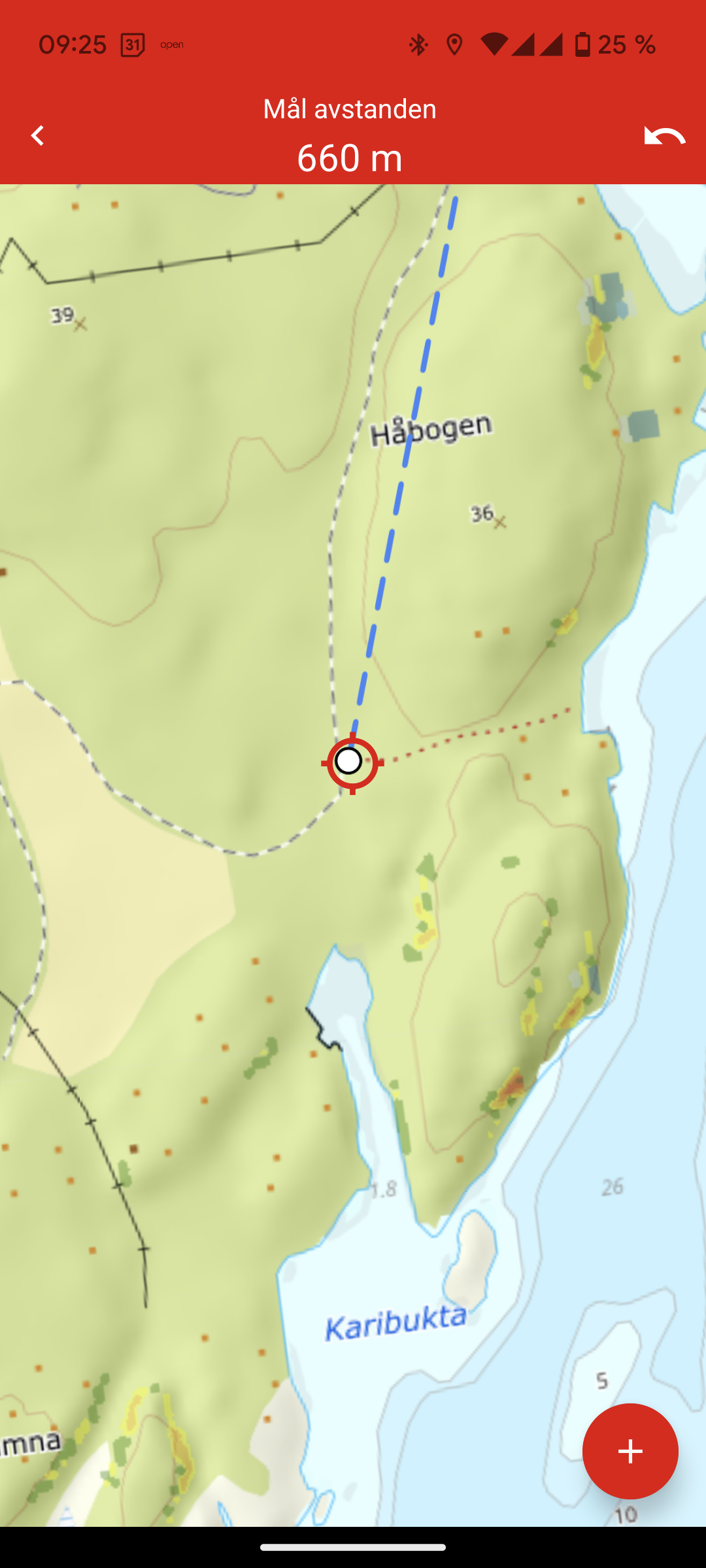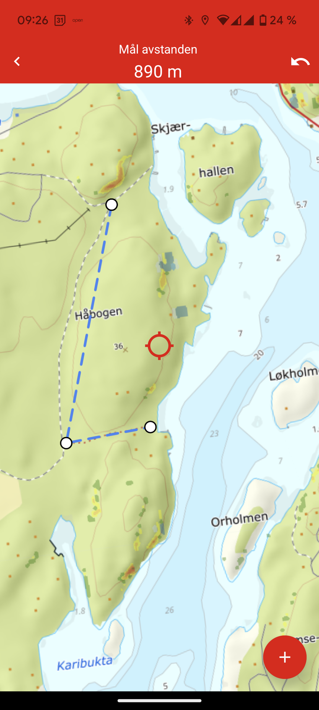 Sett ringen på det stedet du vil starte å måle og trykk på +-knappen. Deretter flytter du kartet slik at den røde ringen viser neste punkt og trykk på + igjen. Du fortsetter slik til du har målt hele ruta (den vil måle avstanden i luftlinje mellom punktene dine). Du ser etter hvert som du legger til punkter den totale avstanden